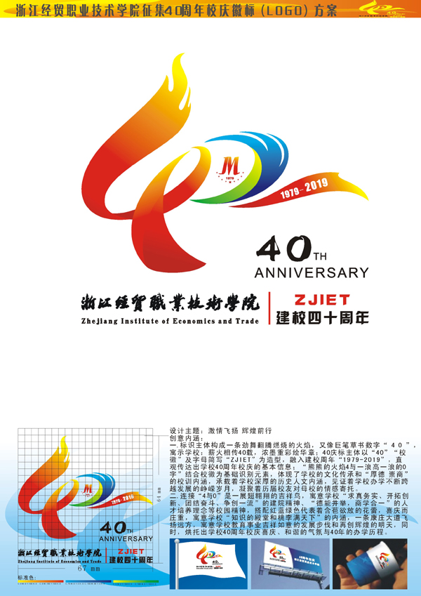 学校40周年校庆标识(LOGO)设计方案征集活动启动以来,共收到45件应征作品。学校对应征作品进行评选,共评选出一等奖1个,二等奖2个,三等奖3个。现将获奖情况予以公示,公示时间为2019年11月21日-28日。如有意见请向学校宣传部反映。联系人:李孜慧,电话:0571-86929713。