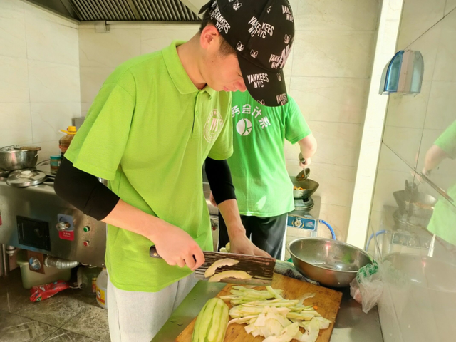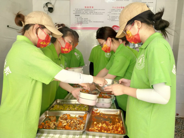 “银丝爱心餐、暖心又暖胃!”送餐当天,实践团队全体成员起了个大早,购买食材、洗菜配菜、烹饪分餐……在不足10平方米的配餐点里忙的热火朝天。