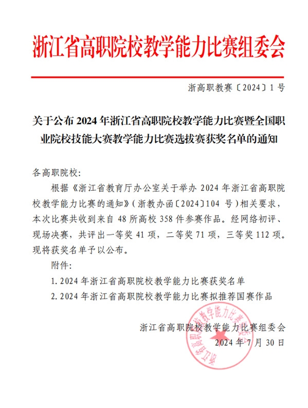 本届浙江省高职院校教学能力比赛由浙江省教育厅主办,金华职业技术大学承办。该赛事不仅是教师专业成长的助推器,也是教师队伍建设的孵化器,更是教学能力提升的加速器。据悉,本次共有全省48所高职院校选送的358件作品参赛,涵盖了公共基础课程、专业课程以及思想政治理论课程等多个组别。经过专家网络初审的严格筛选,最终有112件优秀作品脱颖而出,进入了决赛阶段,最终评选出一等奖41项,二等奖71项,三等奖112项,其中14件作品将代表浙江省参加2024年全国职业院校技能大赛教学能力比赛。